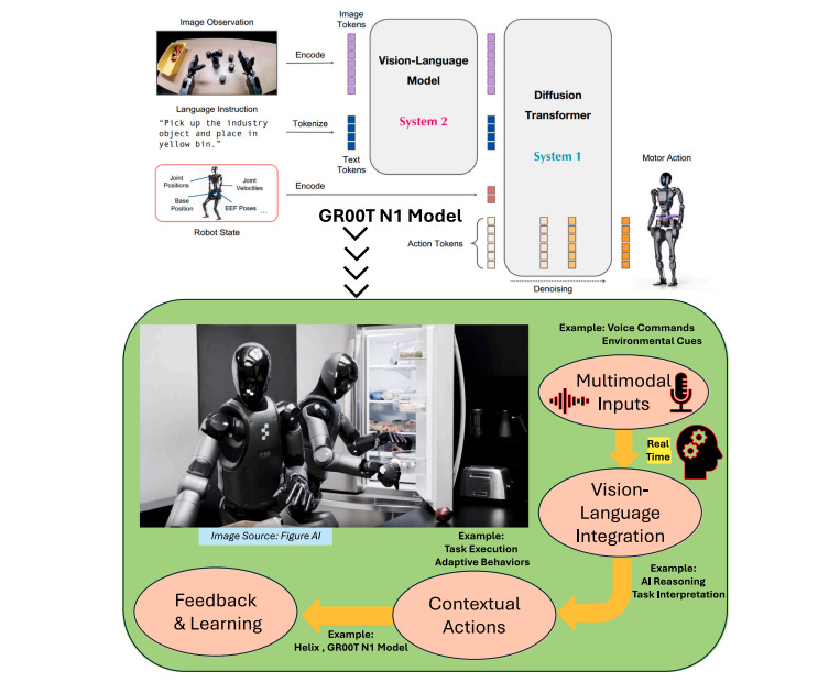 This hybrid approach becomes particularly compelling in robotics applications. Systems like NVIDIA’s GR00T N1 demonstrate how vision-language-action models can integrate multimodal reasoning with precise motor control. The robot’s ability to process visual observations and language instructions through an LVLM backbone, then generate precise actions via a Diffusion Transformer, exemplifies the seamless integration possible between contextual understanding and spatial precision.